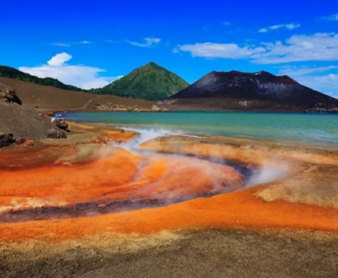 Rabaul ligt aan de voet van de actieve Tavurvur vulkaan, die in 1994 en 2014 (kleinschaliger) tot uitbarsting kwam. De hele omgeving, inclusief de Simpson baai werd bedekt onder een laag as en lava. U kunt de desolate omgeving van de vulkaan bezoeken, een bizar maanlandschap dat u niet direct met Papoea Nieuw Guinea zult associëren. In de Tweede Wereldoorlog is hier veel gevochten en was Rabaul een belangrijke basis voor de Japanners. Veel herinnert hier dan ook aan WOII, waaronder diverse scheepswrakken in de baai, de bunker van admiraal Yamamoto en het Japanese Peace Memorial. Vandaag bezoekt u veel plekken die aan deze periode herinneren. U begint met een bezoek aan het Kokopo oorlogsmuseum. U bezoekt Japanse bunkers en tunnels, een oud ziekenhuis en commandopost. Ook brengt u een bezoek aan de omgeving van de Tavurvur vulkaan inclusief de warmwaterbronnen. Vraag per plekke naar de mogelijkheden om een van de lokale vuurdansen te aanschouwen, de zgn. Baining Fire dance. Dit is een van de meest indrukwekkende dansen die u in Papoea Nieuw Guinea zult zien. Er wordt een groot vuur aangestoken. Als het vuur goed brandt, beginnen de dansers, al slaand met de stokken op een bamboetrom, te zingen. Een voor een komen de dansers tevoorschijn. Sommige dansers zijn zwart geschilderd en hebben een rode punthoed met een pluim van een meter of twee. Ze komen één voor één, dragen pakken van bladeren en grote maskers van eendenkoppen. Allemaal zijn ze anders. Ze dansen een poosje voor het orkest, alleen of in kleine groepjes. Daarna dansen ze om het vuur in een kring. Als het vuur alleen nog maar gloeit, lopen de dansers er door heen en schoppen de sintels alle kanten op.