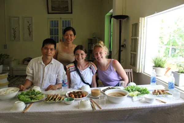 Vertrek ‘s ochtends richting de Dong Ba-rivier - een zijtak van de Parfumrivier - voor een afspraak met meneer Thanh uit Hue. Als gepassioneerde kok werkte hij tijdens zijn éénjarige verblijf in de VS in een Vietnamees restaurant. Hier heeft hij veel kennis opgedaan van de westerse keuken en cultuur. Tegenwoordig is hij verantwoordelijk voor het dagelijks koken voor zijn gezin, waarmee hij breekt met de Vietnamese gewoonte die de keukentaken aan de vrouw toeschrijft. Samen met Mr Thanh wandelt u naar de Dong-Ba markt waar u de benodigde ingrediënten voor de kookles inslaat bij een van de vele authentieke kraampjes. Terug bij zijn huis begint de kookles met de bereiding van typische gerechten van Hue. Samen met Mr Thanh en zijn vrouw bereidt u onder andere 'Nem Lui' - een loempia gevuld met varkensgehakt, bijbehorende zoete pindasaus, een tomaten-ananas soep, bananensalade, gevulde inktvis, en meer! Geniet rond het middaguur van de lunch op het balkon van het huis en voer een goed gesprek met de familie.