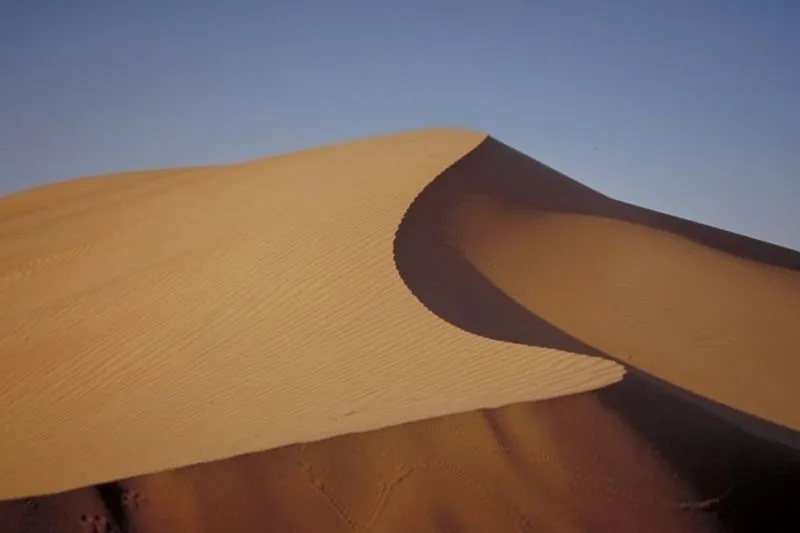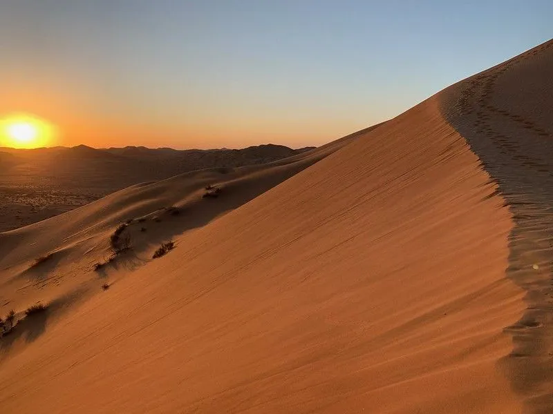 Niks mooiers dan diep de woestijn inrijden en ergens een zandduin beklimmen en op de richel gaan zitten, liefst in de avondschemer. En dan genieten we van het fabelachtige uitzicht. Zandduinen zover als de horizon strekt. Een ondergaande zon. Een landschap dat langzaam rood kleurt. En dan de stilte, een kampvuur en een eindeloze sterrenhemel. Een waanzinnige ervaring; overnachten in de woestijn.