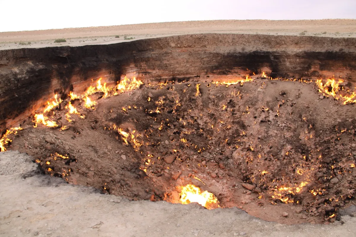De Poort naar de Hel: Deze gaskrater in de woestijn staat al decennialang in brand staat. Door een fout van sovjet-geologen is de gaskrater ontstaan. In de jaren ’70 werd hier geboord op zoek naar olie- en gas. De grond stortte in en er werd een ondergronds grottenstelsel en gasvoorraad gevonden. Het gas verspreidde zich door het grottenstelsel. De geologen dachten het probleem op te lossen door het gas op te laten branden en staken het in brand. Nog altijd brandt deze krater. Vooral ’s nachts levert dit een schitterend beeld op; de verlaten woestijn en de brandende vuurhaard.