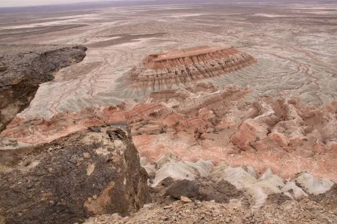U reist verder noordwaarts door de valleien van de Balkan bergketen, waar u kuddes kamelen ziet grazen. Na het dorpje Koshoba wordt de weg slechter, verlaat u de laatste resten beschaving en rijdt de regio Yangi Kala binnen. Deze regio grenst aan het Kaplankyr natuurreservaat. Het bizarre maanlandschap is ontstaan doordat dit ooit de opgedroogde prehistorische Para Tetis zee was, waar het water zich zo'n 5 miljoen jaar geleden terugtrok. Wat rest is een bizar landschap van spectaculaire rotsen en kliffen. Hoe dieper u Yangi Kala in rijdt, hoe dichter u bij de Karabogaz Gol komt. Door het moerassige landschap kunt u niet tot bij deze afgesloten baai aan de Kaspische Zee komen, maar de kliffen zelf kunt u vanuit alle perspectieven aanschouwen. Zowel vanuit de jeep als te voet, voor wie graag een stukje wil wandelen. De naam Karabogaz Gol betekent 'Zwarte Muil' en het water heeft een zoutgehalte van 35%, wat het zouter maakt dan de Dode Zee (33%).